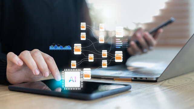 Businesses are using tablets and smartphones with AI workflow automation and data management systems. Concepts of artificial intelligence, big data, digital transformation, and smart technology.