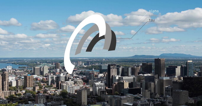 Digital graphs overlaying urban skyline and clouds