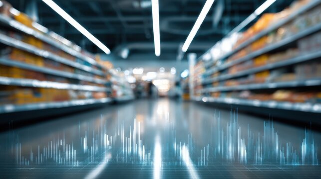 Retail Analytics Concept Highlighting Data Overlay in Supermarket Aisle Showcasing Modern Business Intelligence Environment With Clean Lines