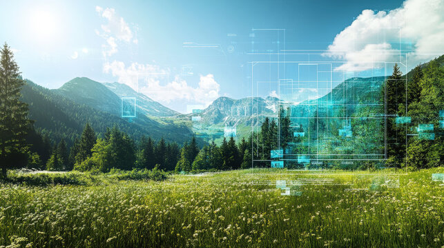 Scenic mountain landscape with lush meadow data overlaying the view to showcase the concept of data analytics and nature conservation and eco-friendly tech