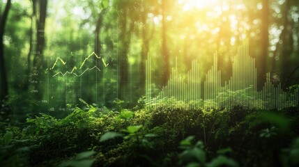 Green bar chart with upward arrow overlays lush tropical forest, symbolizing growth in sustainable finance, environmental progress, and positive esg trends for nature conservation