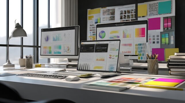 Sleek Multi-Screen Workstation for Data Analysis and Creative Design.