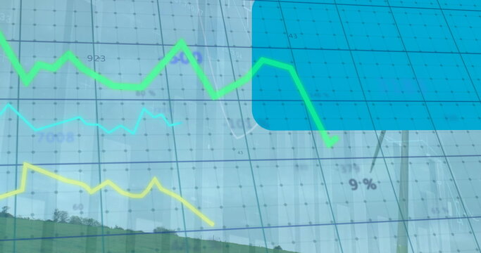 Gridlines and three color line charts overlaying grassy hillside, scattered trees and wind turbine