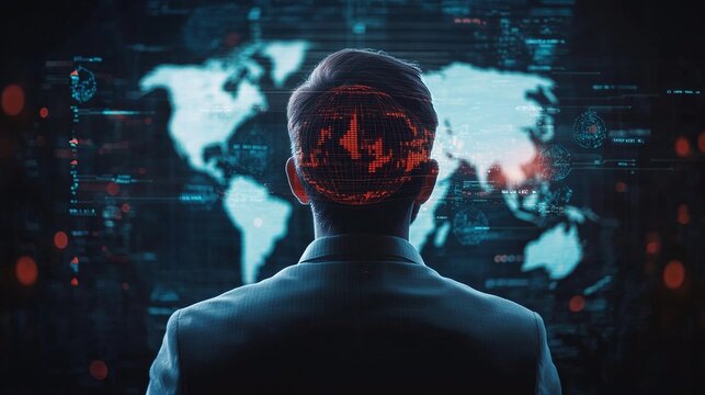 Man in suit stands before large digital world map display. Data visualizes global connections and information flow. Modern newsroom displays tech network on screen.