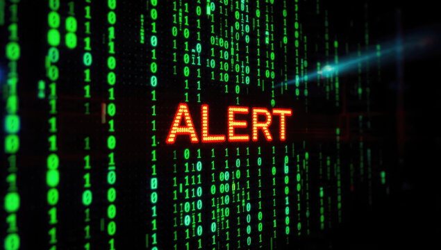 Digital 'ALERT' in red, surrounded by falling green binary code, signifying a critical cyber security warning, data breach, or system error.