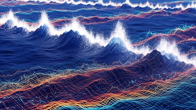 Glowing blue fiber optic strands radiate from a central point against a dark background with sparkling particles and bubbles with technology and science with innovation