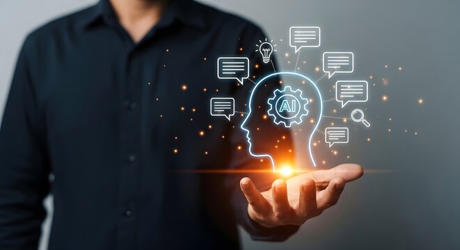 A person holding a glowing ai head with gears and speech bubbles in their open hand space