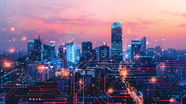 Modern cityscape with digital circuit overlay, depicting the concept of smart city technology
