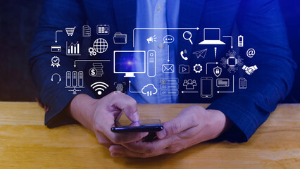 Businessman using technology equipment and line interface icons, Computer system resources and data storage, Cloud service technology marketing and business concept.