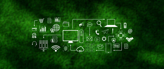 Technology equipment and line interface icons, Computer system resources and data storage, Cloud service technology marketing and business concept, for background.