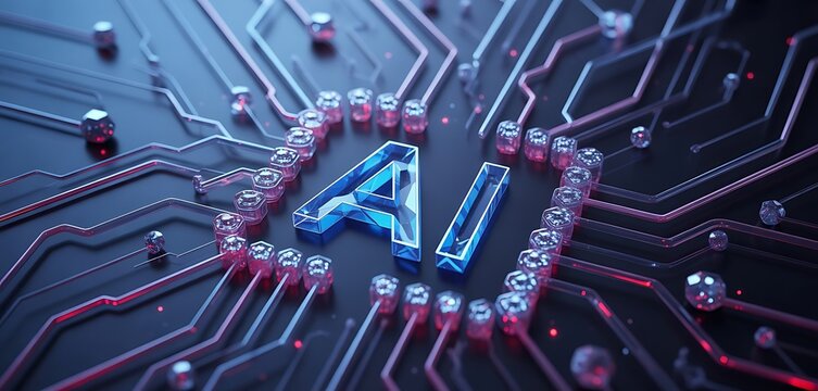 illustration of close up view of an advanced artificial intelligence circuit board with glowing elements and the AI symbol at the center. Generative AI