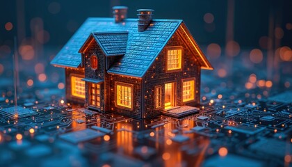 Futuristic smart home concept with glowing digital features. Architectural visualization represents modern house integrated with advanced technology, connectivity, innovation. Blue, orange lighting