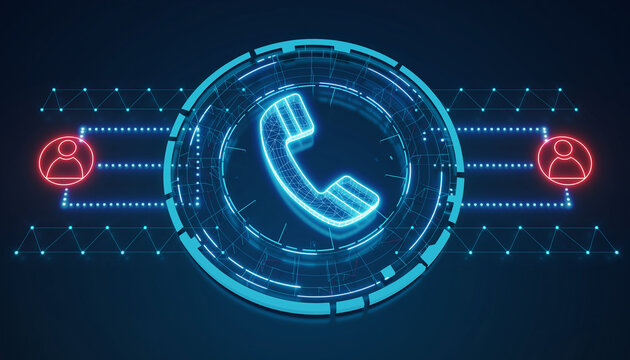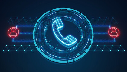 Digital call concept, a glowing futuristic phone symbol surrounded by interconnected data points and icons, representing communication technology.