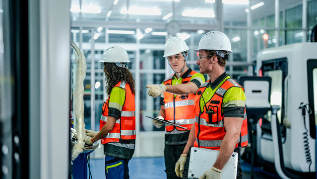 Engineers program an industrial robot or CNC machine using an AI interface. The team manufactures advanced microchips or components in a futuristic smart factory.