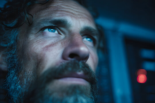 Portrait of man while running servers in a data centr. Close-up. Generative Aicontent