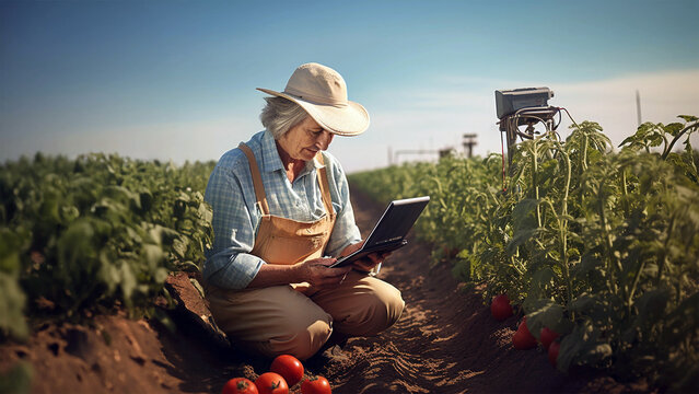 Elderly female farmer holding a laptop and soil analysing device near tomato plants. Concept of tech integration in agriculture for quality monitoring, use of new smart technologies by older people