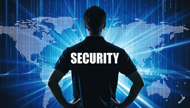 Powerful concept of security against digital threats shown with a person facing a map of the world
