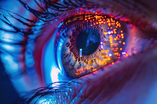 Digital surveillance concept. Closeup of human eye with digital chip iris