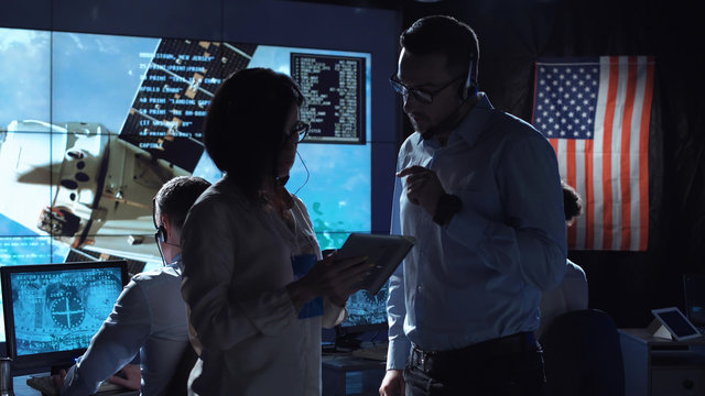 Project manager and computer science engineer collaborate using big screen display and laptop, analyzing infrastructure infographics data for telecommunications company system control and monitoring,