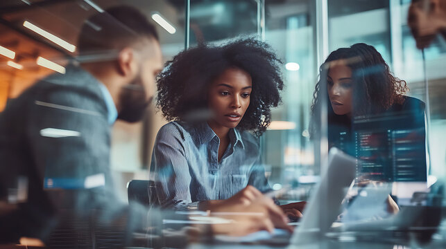 Description: A team of professionals working together in a glass-walled meeting room, analyzing data on a laptop and taking notes, showcasing effective communication and teamwork in a collaborative