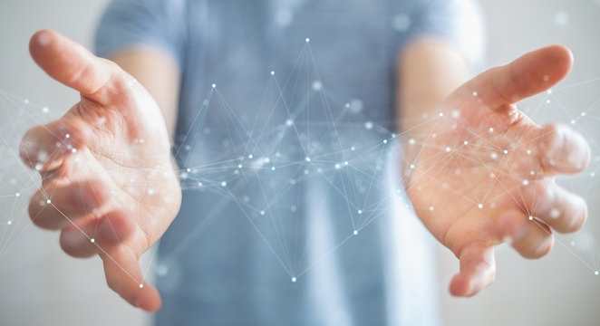 Businessman using floating digital network connections with dots and lines 3D rendering