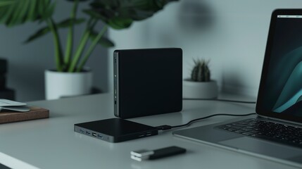 External hard drive setup modern workspace technology image minimalistic environment close-up view digital storage solutions
