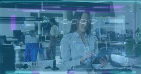 Professional working on data science project with digital interface and graphs on laptop in modern office environment. Asymptotic smart data analytic.