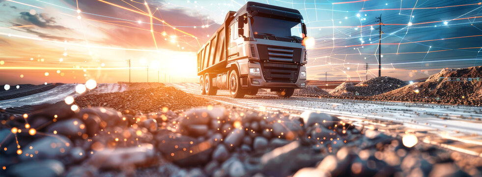 A dump truck drives through a construction site illuminated by a futuristic, digital network of data lines and points