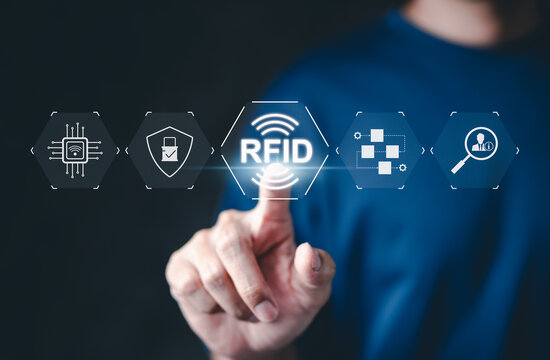 RFID Tech, Radio Frequency Identification. A hand pointing to an RFID icon, data security, identification, system integration, and the concept of radio frequency identification in modern technology.