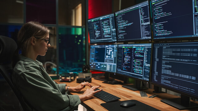 Female Cyber Security Specialist Writing Code On Deskop Computer with Six Displays in Dark Office. Caucasian Woman Controlls Digital Protection System, Monitoring Data, Debugging Software Errors.