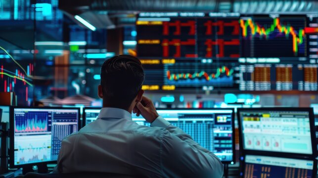 Stock Market Trader Analyzing Charts On Multiple Monitors