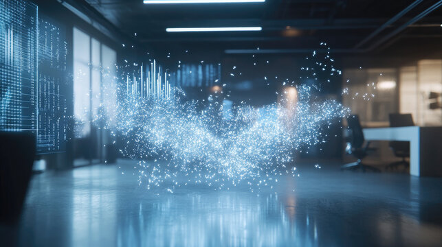 Digital Data Visualization in Modern Office Space with Glowing Effects