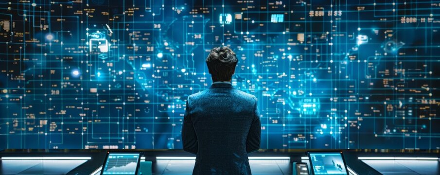 A businessman stands in front of a large screen displaying a complex network of data, representing global connectivity and information flow