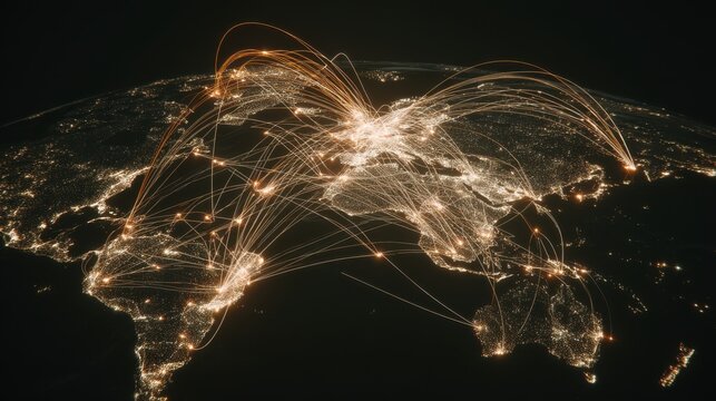 Global connectivity visualization mapping data traffic across continents digital graphics nighttime aerial view insightful concept