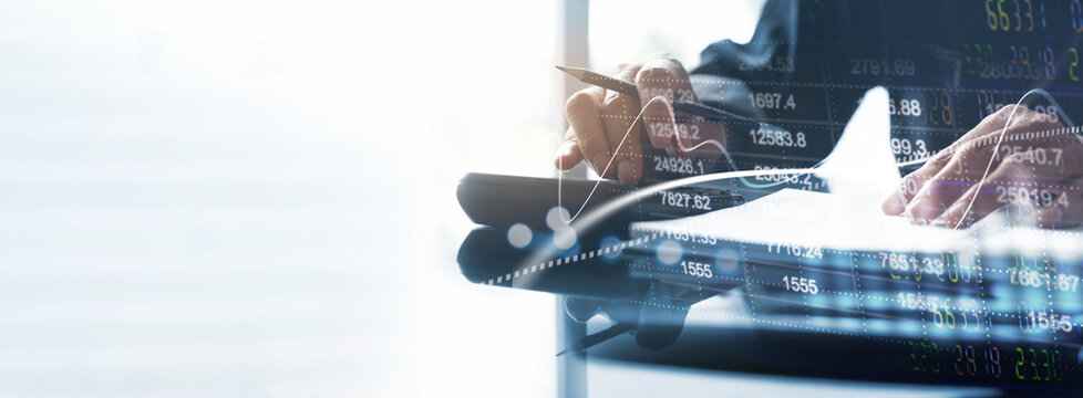 Business, finance and accounting concept. Businessman using calculator to calculate financial report, data analysis, graph growth chart, business planning, strategy and investment