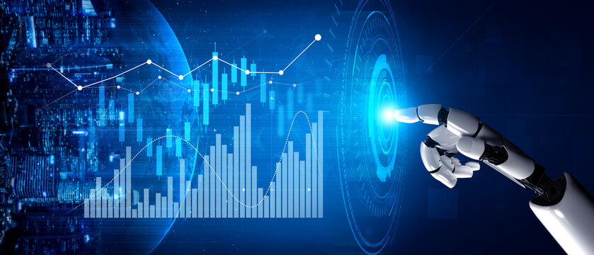 A robotic hand reaches towards a glowing digital interface, symbolizing the fusion of technology and data analysis in a modern, innovative environment. Scalp