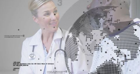 Female doctor consulting colleague with digital global data overlay showing collaboration