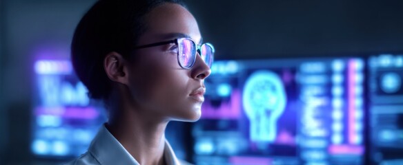 Call center agent with headset and holographic virtual assistants in modern office, focused male operator handling support with futuristic technology and blue hologram figures