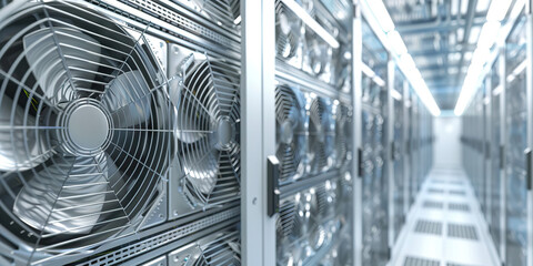 Imposing Row of High-Tech Servers in a Modern Server Room with Efficient Cooling Systems and Intricate Wiring Creating a High Performance Data Environment
