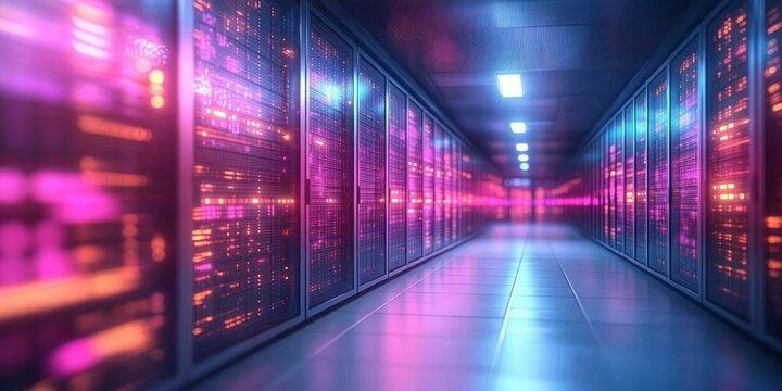 High-Performance Data Server Room with Modern Networking Infrastructure and Blue Neon Lighting