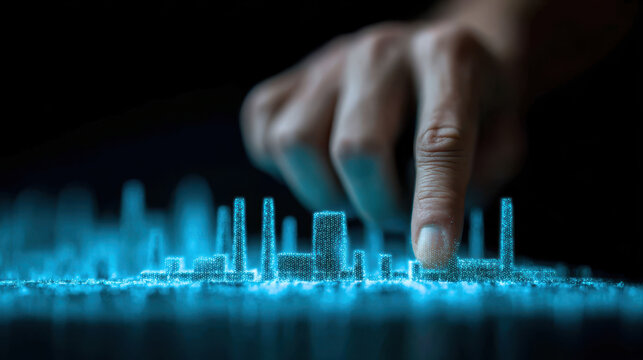 Finger touching futuristic holographic interface displaying smart city skyline with data analytics overlay
