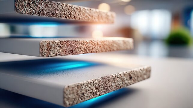 Abstract 3D chart floating above stacked paper; layers highlighted with data visualization