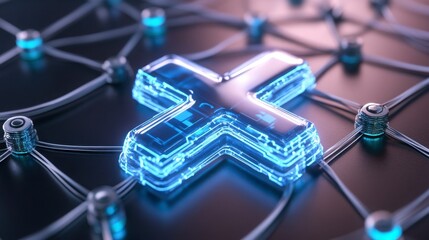 Futuristic Glowing Cross Symbol on Digital Network Background