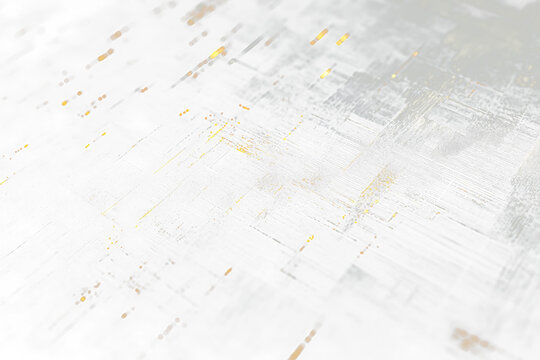 Typing on laptop in open-plan office with digital network overlay and minimalist workspace