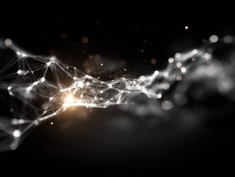 Futuristic flowing network of glowing white nodes and connecting lines forming an illuminated digital mesh across a dark background with soft spark-like highlights
