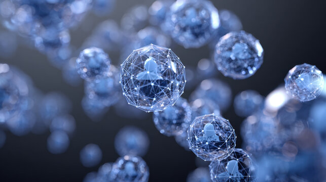 A glowing sphere cluster representing blockchain nodes syncing across a holographic network mesh