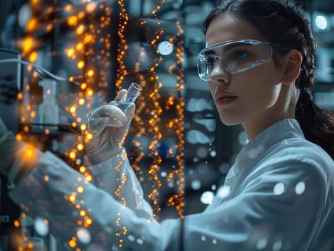 Scientist examining DNA strand in lab tube, AI overlay and green plant samples in futuristic setting