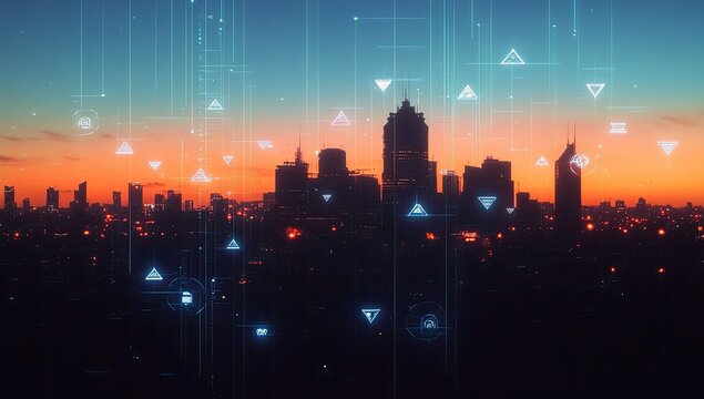 A digital overlay highlights smart city elements against a blurred cityscape, symbolizing innovation.
