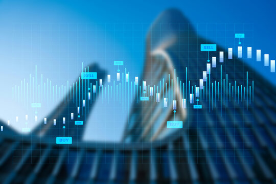 Double exposure of abstract financial graph with world map on office buildings background, forex and investment concept