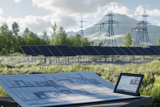 Futuristic electricity infrastructure with raising data analysis panels